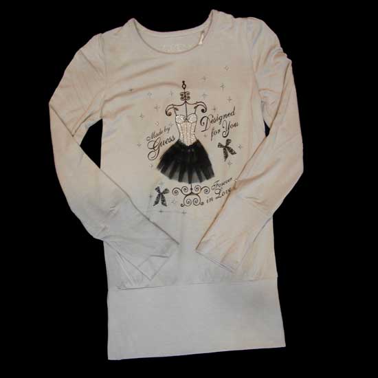This ladies’ long-sleeved T-shirt features banded cuffs and hem for added warmth in early spring and autumn days. The pattern of a lace dress hanging on the hanger lends an adorable accent to the design. This cozy T-shirt is a great choice for every lady.
