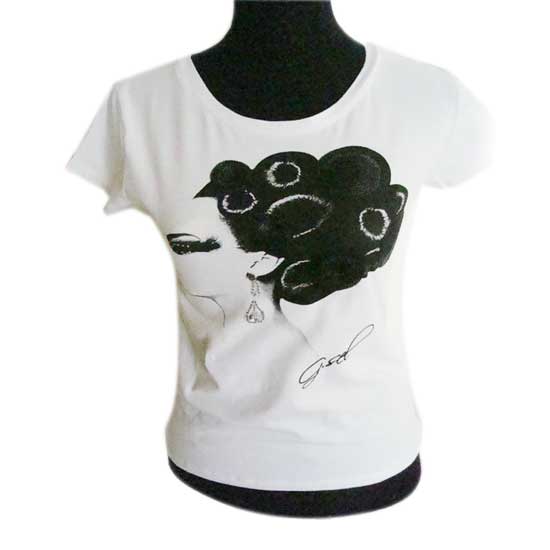 This fashionable ladies’ T-shirt is made of combed cotton with spandex for coziness. It features photo printings with shiny strass at the eyes, a nice stone at the ear and full sequins embroideries at hair. This round-neck and short sleeved T-shirt goes great with a pair of short jeans.