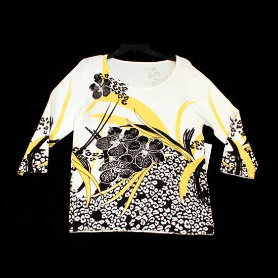 This is a ladies' T-shirt that is made of 80% viscose and 20% polyamide. It is accented with colorful prints for a decorative touch. This stylish tee-shirt offers a breathable and comfortable fit to wearers.
