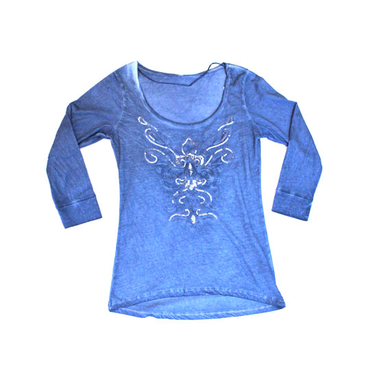This is a ladies’ T-shirt that comes in allover blue for a vibrant look. It is designed with a classic round neckline and long sleeves. The unique patterns on the front add a touch of style to the whole piece