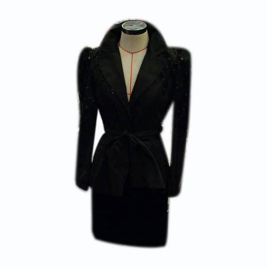 This unique jacket has leg-of-mutton sleeves and a bold fabric belt at the waistline. It is black in color and is easy to match blouses and shirts of different colors. This jacket is great for office ladies who want a distinctive smart-casual look.