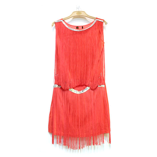 This round-neck ladies’ tank dress features a bright red exterior, which is sure to steal the limelight. The allover tassel lends a touch of uniqueness to the appearance. The neckline and waistline are adorned with silvery trim for a sense of vogue.