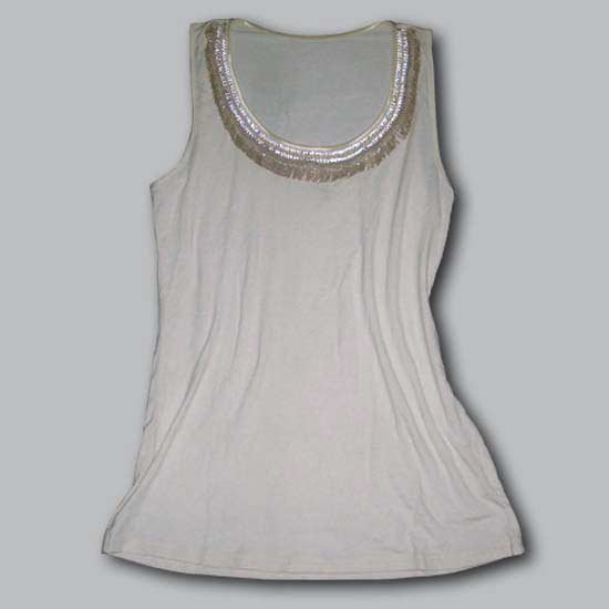 This tank top boasts a subtle yet fashionable design. Shiny metal chains, embroidery and shiny stones are added to embellish the plain top. This plain yet stylish design goes well with a range of pants and skirts.