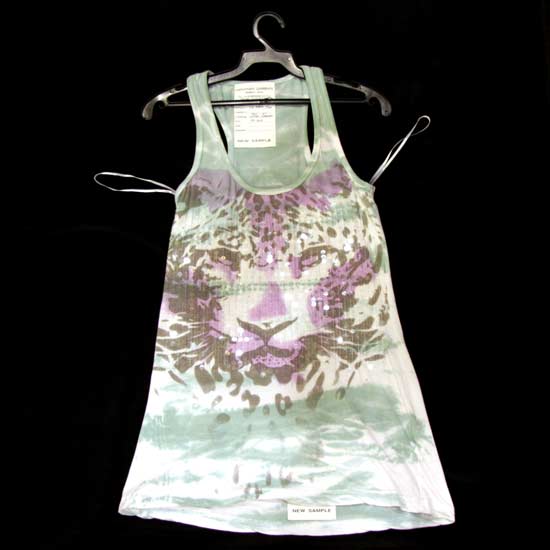 The ladies' tank top showcases a tiger print with sequin decoration. It features a scoop neckline and thin shoulder straps. This tank top makes a great choice of summer outfits.