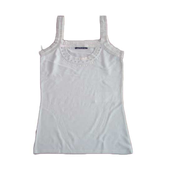 As shown is a ladies’ tank top designed with a slim-fit cut and a pair of spaghetti straps. The top comes in pure white to allow easy mix and match. Shiny stones are added along the straps and neckline to show an enhanced style.