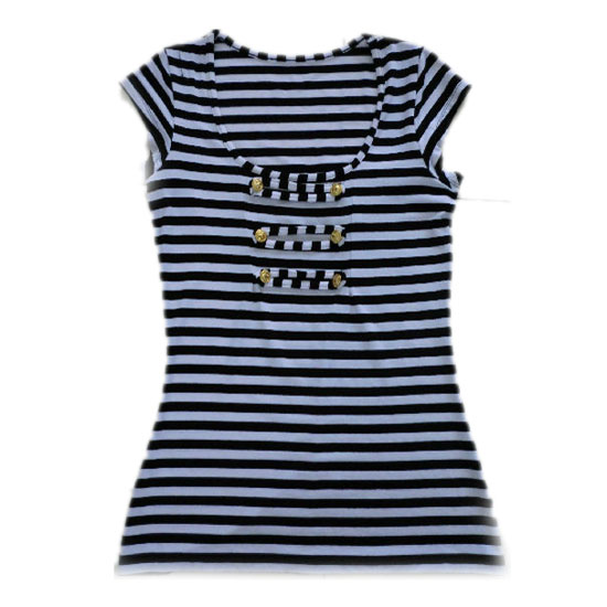The ladies' tank top is styled with stripes in contrasting tones. It features a tight cut to project your body shape. The front of it is trimmed with band and stud details for style.