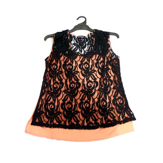 This ladies’ tank top comes in a captivating peach tone with a black lace overlay. The delicate floral lace lends it extra chic and elegant flair. This gorgeous tank top is finished with a flared hem for added vogue.