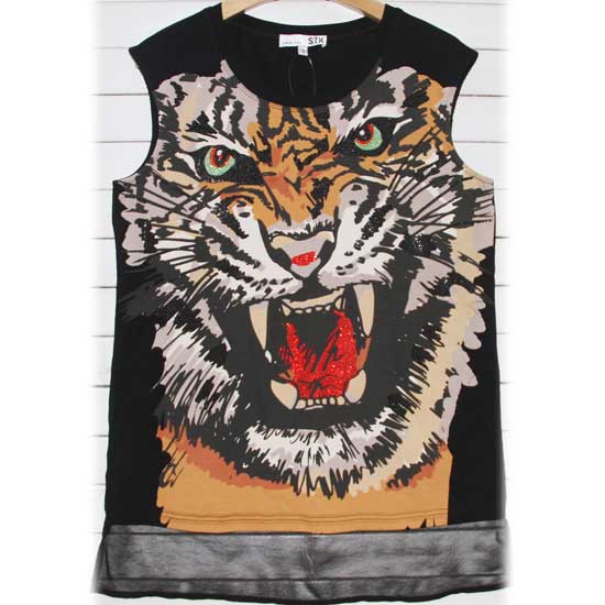 This ladies' tank top features a roaring tiger motif on the front. The tiger motif is finely printed with vivid colors and great details. The trendy tank top will add a touch of uniqueness to your look.