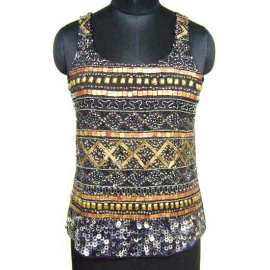 This eye-catching ladies' tank top is hand embroidered with shimmering sequins and beads in different colors and designs. It showcases meticulous craftsmanship with exquisite details. The fascinating tank top will add endless glamor to your summer look.