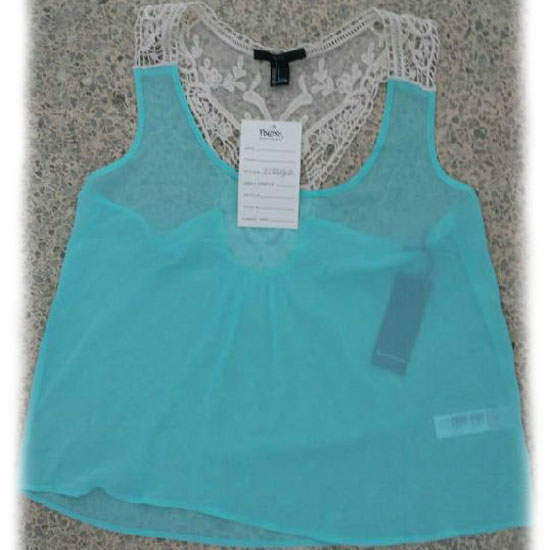 This is a ladies' tank top with a fashionable design. It comes in semi-transparent blue with a lace back. This tank top is easy to mix and match with different outfits.