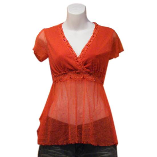 - The ladies' top is designed with short sleeves, V-shaped neckline, high waist with mesh lower part.