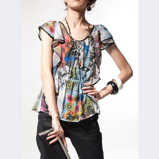 The ruffled sleeves beautify this multi-colored lady blouse. The black trimmings distinctly emborder on the neckline and the ruched sleeves. A elastic bind is designed at the waist, letting ladies exuding their beauty.