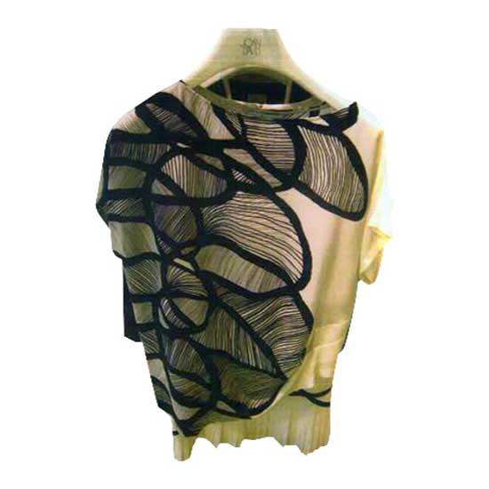 As shown is a ladies' top featuring a tapered shape. The top comes with two short sleeves. Its front showcases an extensively covered pattern constituted by bold and slender lines.