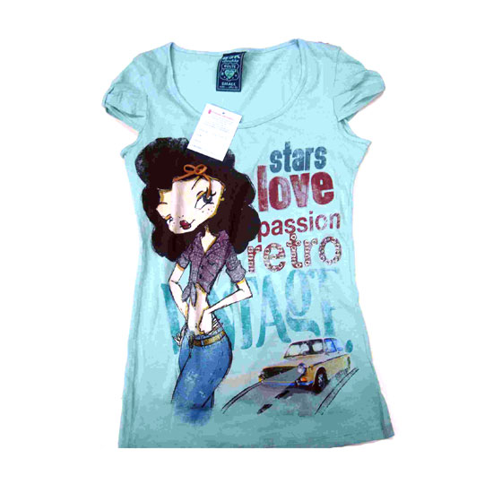 Shown here is a ladies’ cap-sleeve tee coming with a slim cut. The tee features a large cartoon print with metal gel to draw attention. The design of this tee goes well with a casual look.