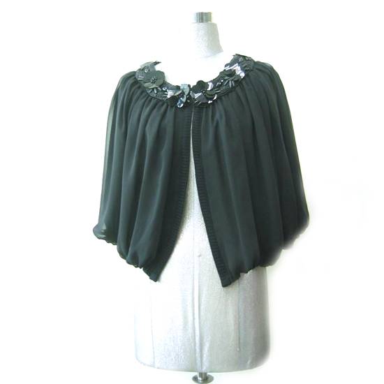 This is a cape designed for ladies. It is made of woven silk. The cape features a flower-shaped sequin neckline.