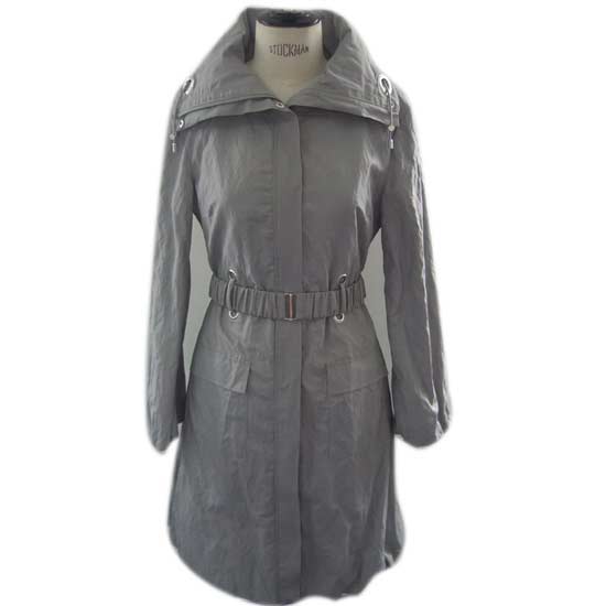 The ladies' trench coat comes in classical gray finish with an adorable style. The lightweight cotton and nylon construction with a glint of metallic offers a glossy sheen. This timeless trench coat is a must-have item to add to your wardrobe.