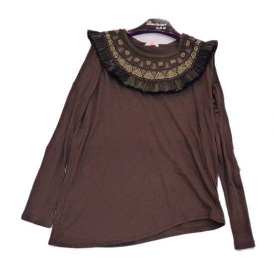 This ladies' tunic features a round collar adorned with gold-toned beads and ruffle details. The loose-fit tunic is extremely comfortable for wearing. This flattering tunic is completed with an asymmetrical hemline and long sleeves.