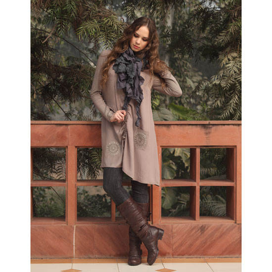 Featured here is a long sleeve tunic designed for fall and autumn. This simplistic tunic is decorated with fancy crocheted patterns. The smooth fabric and loose structure prioritize wearers' comfort.