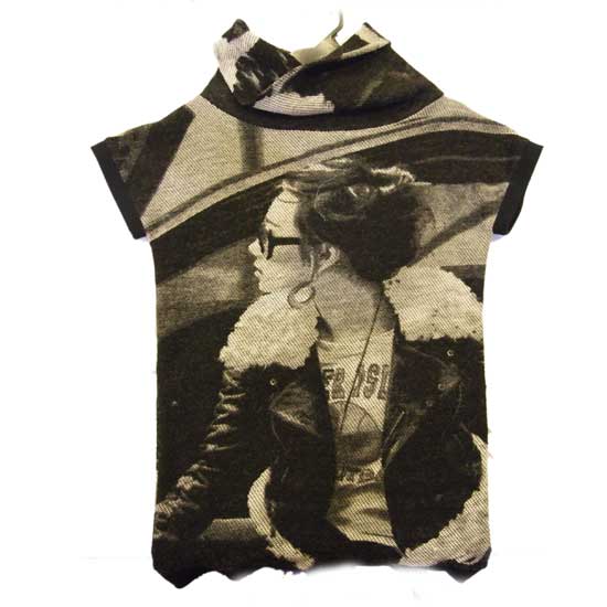 This luxurious ladies' tunic is finely crafted of rabbit fur. The unique tunic spotlights the black and white graphic of a fashionable lady on the front. The draped turtle-neck and cap sleeves finish the look of this tunic.