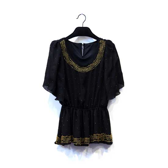 This ladies’ polyester tunic in black features golden toned decorations along the round neckline and the hem. It is designed with a gathered waist to show your slim figure. This fashionable tunic is a great choice for young ladies.