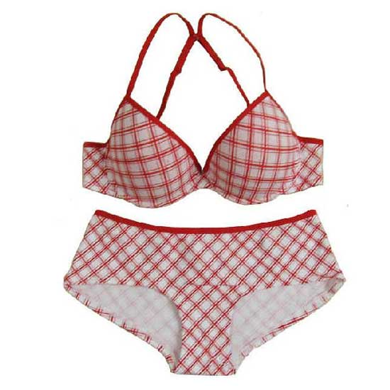 This ladies' underwear set comes with a red and white checkered pattern. The hem of the set is decorated by a modest border in red. This comfortable underwear set lifts the wearer's mood.