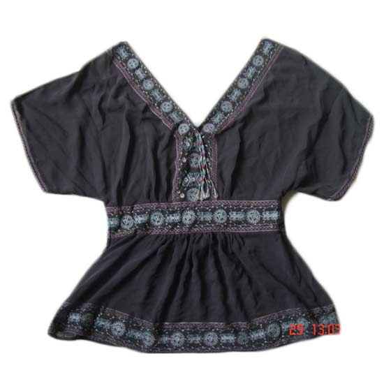 The ladies' blouse features a V-neckline and a pair of bat sleeves. The colored borders on the neckline and hemline add an extra touch of style to the design. This ladies' blouse makes a pretty way to complement ladies' fashion ensemble.