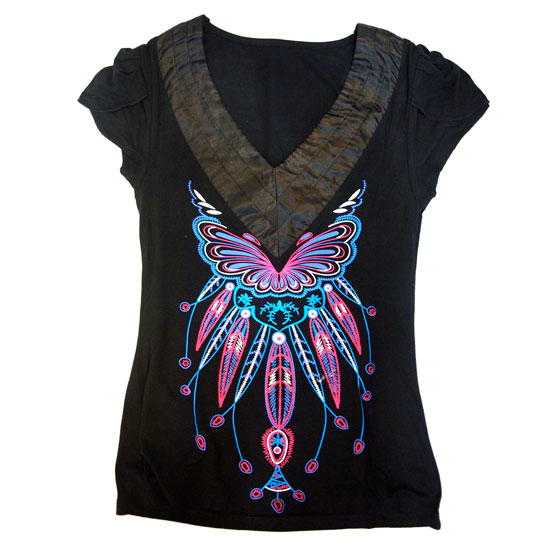 This ladies’ black hued T-shirt features a gleaming V-neck design with delicate patterns. Made of 95% viscose and 5% spandex, the T-shirt is extremely cozy to wear. This characteristic T-shirt is sure to set you apart from others.