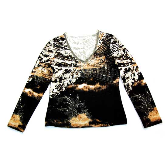 The ladies' top comes with a V-neckline and long sleeves. It showcases spilt ink patterns for a decorative touch. This top goes perfectly with a plain-colored bottom item.
