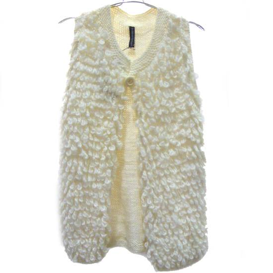 The vest coat is sleeveless with a round collar fastened by a button. The white coat is made of acrylic, wool and mohair which give a soft texture and warm the wearer under cool or cold weather.