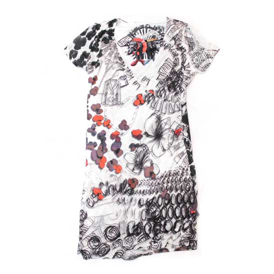 This ladies’ dress comes with a V neckline and short sleeves. It catches your attention with its allover dizzy and abstract patterns. This fashionable one-piece dress with an asymmetric hem shows your unique tastes.