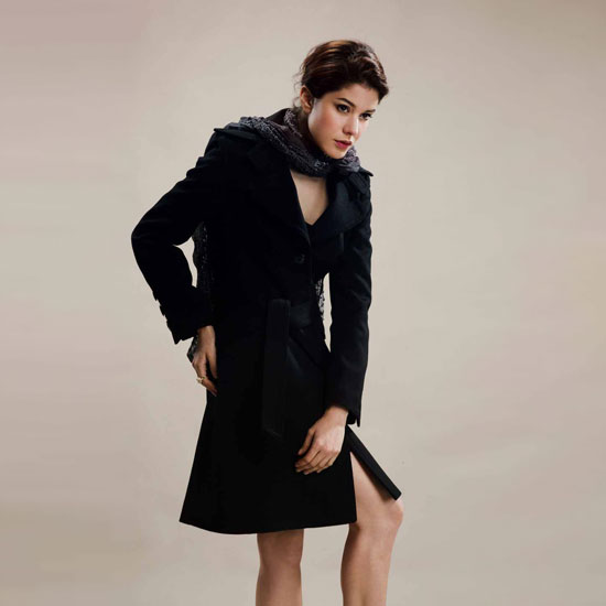 Demonstrated on the female model is a set of smart-casual wear in a theme color of black. The set includes a scarf and a V-neck dress. The set is perfect for building your fall/ winter wardrobe.