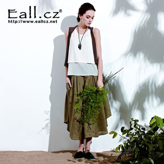 This is a ladies' wear set that comes with a white rayon T-shirt and an olive green linen skirt. The T-shirt boasts a sleeveless design with two layers. This set is a great choice for a casual weekend look.