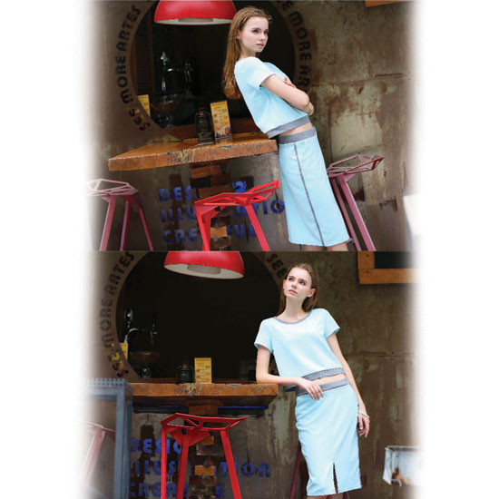 This is a set of ladies' wear with a T-shirt and a matching skirt. Each piece is designed in bright blue with gray accents. The soft texture gives you enhanced comfort.