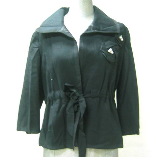 This is a ladies' woven polyester coat with a wide collar. The coat is binded by a long strap instead of buttons and there are flower-like decorations above the right-chest postition.