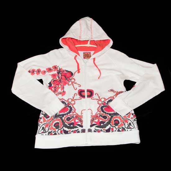 As shown is a ladies’ zip-up jacket coming with a drawstring hood. The jacket is bright white in color, highlighted by sharp orange floral prints and strings. The sporty yet trendy design makes it a great choice for everyday wear.