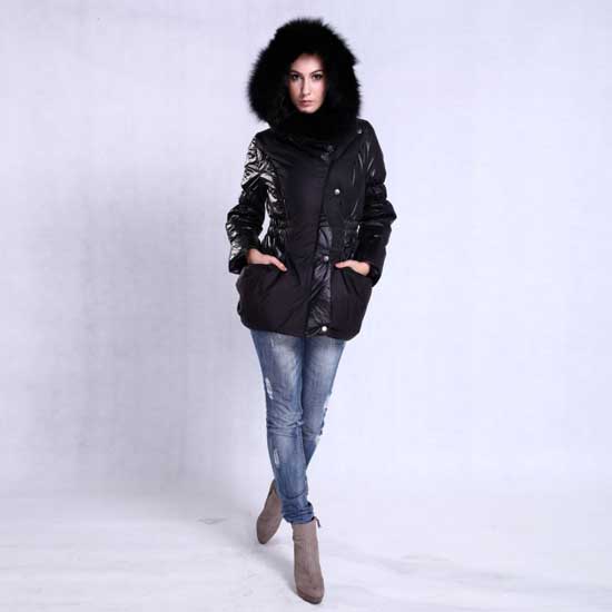 Pictured is a two-tone down jacket designed for the feminine figures. The fur-trimmed hood keeps your head and neck warm, while the side pockets help your hands stay toasty. This winter jacket is beautifully designed to complement any casual outfits.