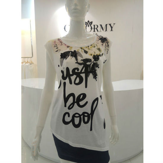 This is a white irregular blouse,front printing with English words and beautiful flowers,and then have nail bead piece on the printing. The blouse fabrics is cotton,hand feeling is soft and comfortable,is suitable for wear in summer.