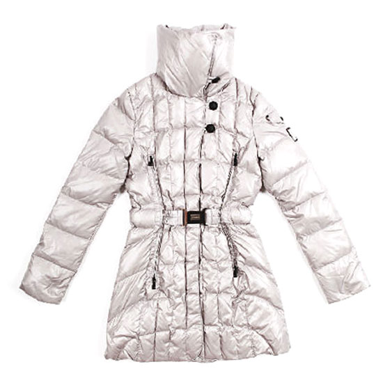 This thigh-length ladies' down coat offers a stylish way to protect you from cold winter weather. It features a smooth and glossy pearl white exterior made from Korean fabric. The coat is completed with a turtleneck, a belted waist as well as button and zipper closure.