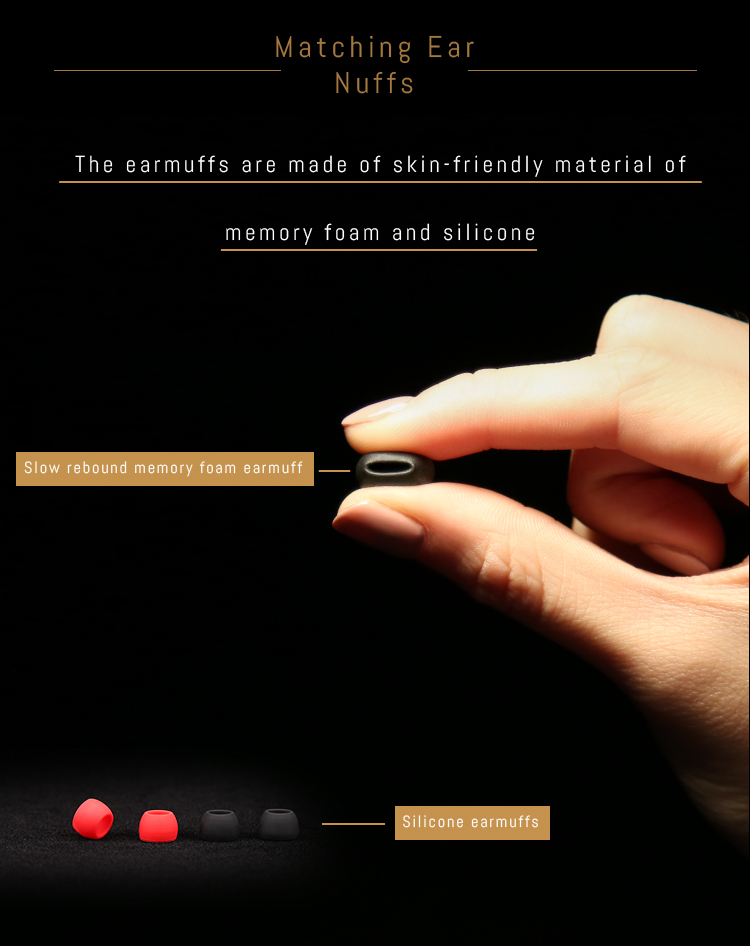 • Packing:  Headphones*1, black slow rebound memory ear caps*1, red silicone earmuffs*1, manual warranty card, storage bag
