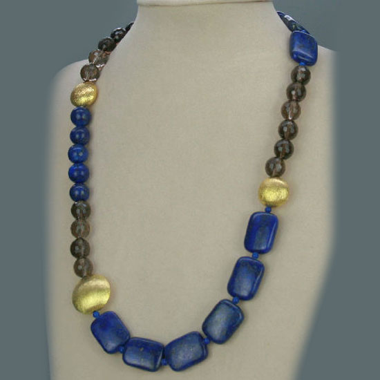 Showcased here is a lapis necklace that comes in a matinee style. Large lapis, smoky quartz and brass pieces are joined together in a unique arrangement to form a chain of sophistication and classiness. Fashionable and eye-catching, this high quality lapis necklace will jazz up your look immediately.