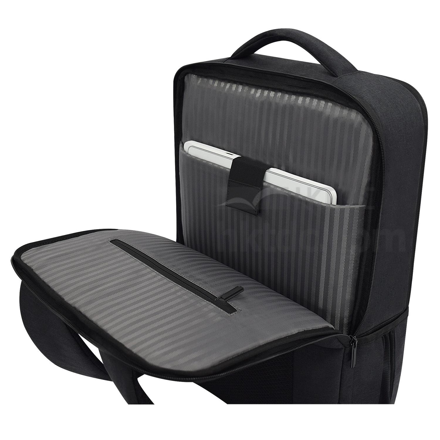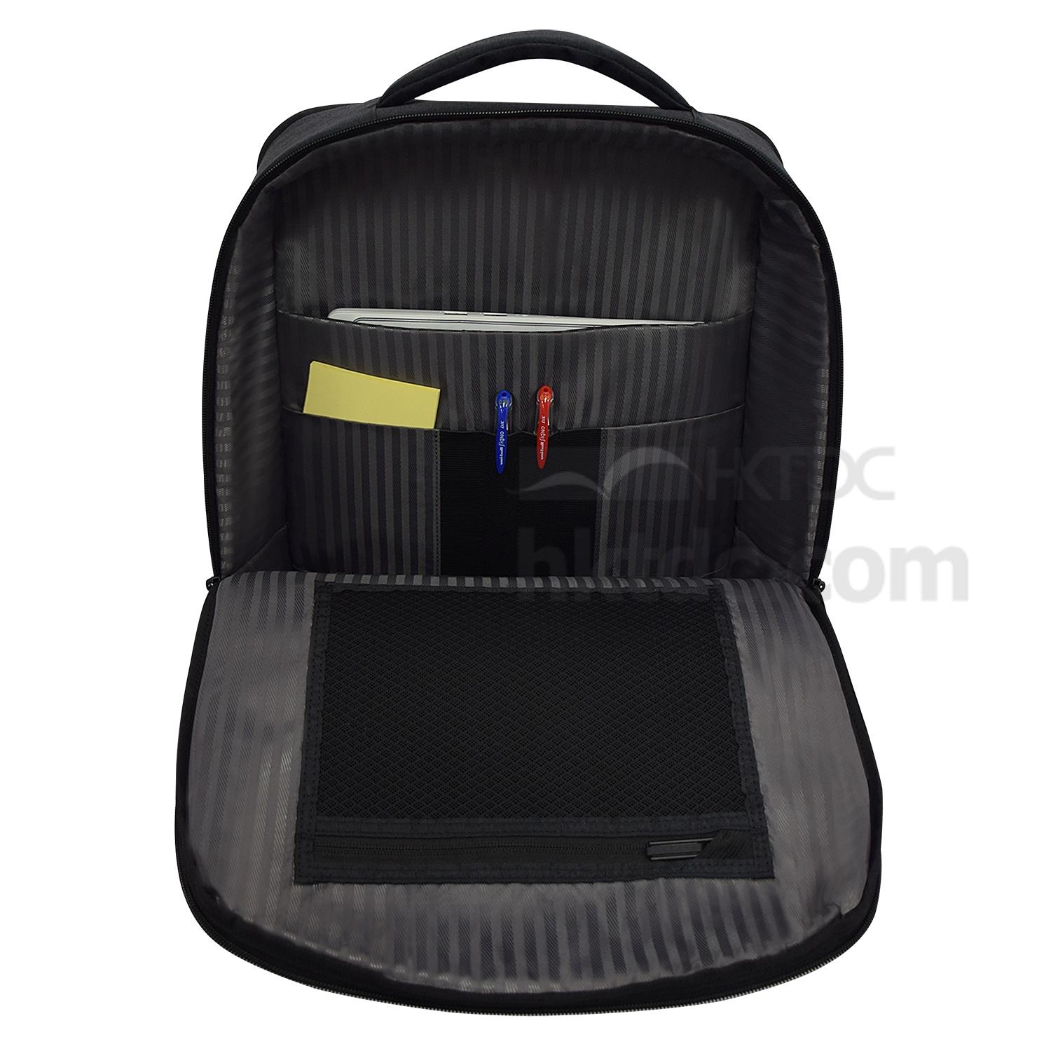 Secondary compartment offers a series of organizer pockets to hold tech accessories and other small items.