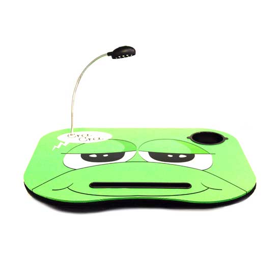 This novel laptop desk features a funny cartoon face design on the surface. It is fitted with a mini-sized desk lamp to provide soft and glare-free light. The plastic laptop desk is wear and age resistant.