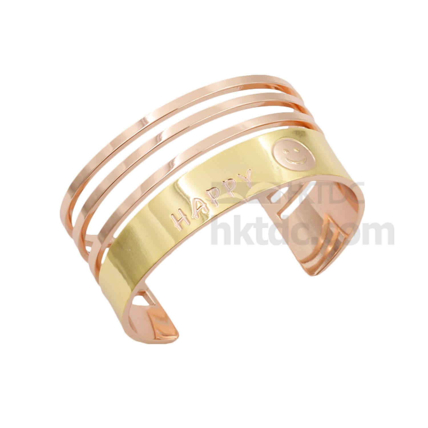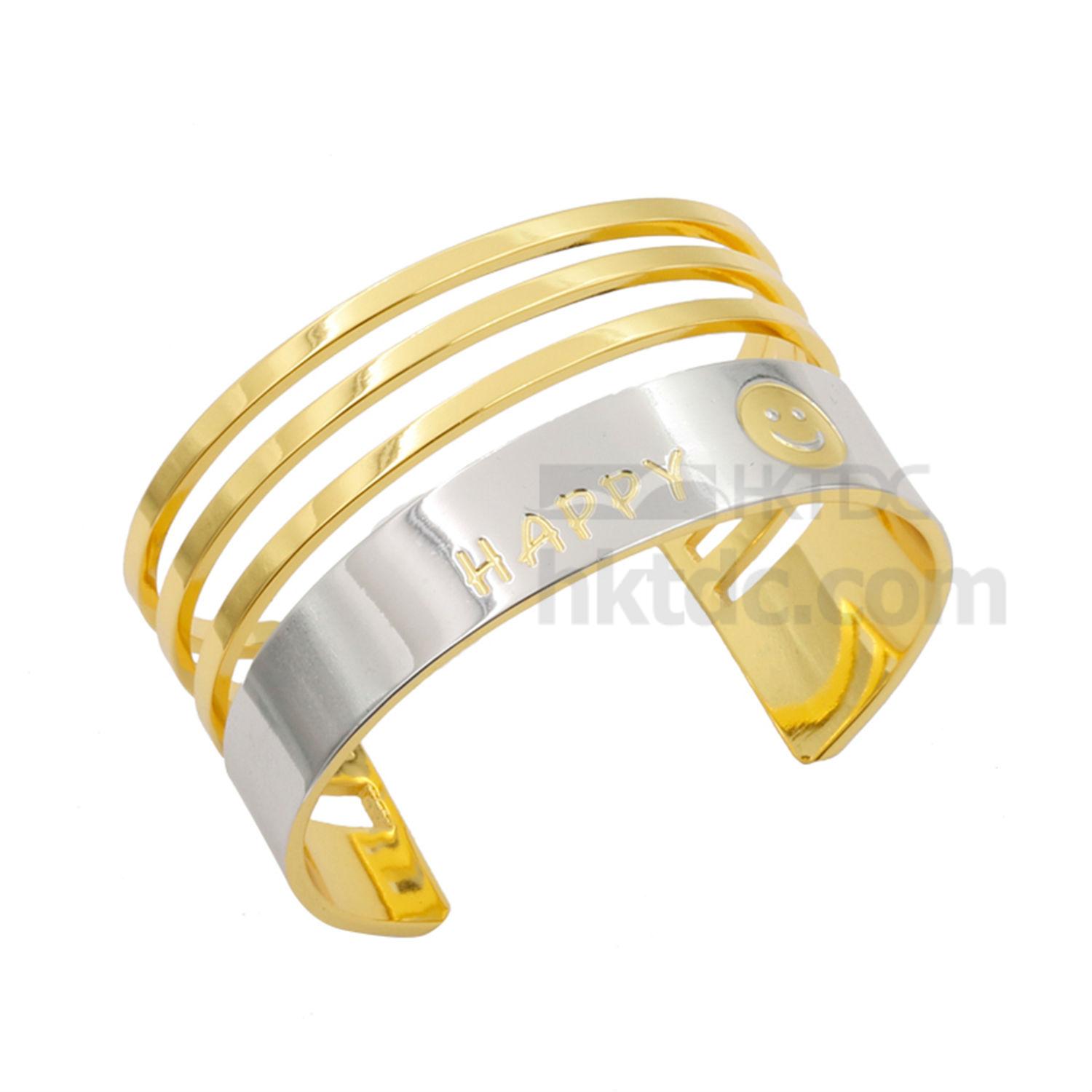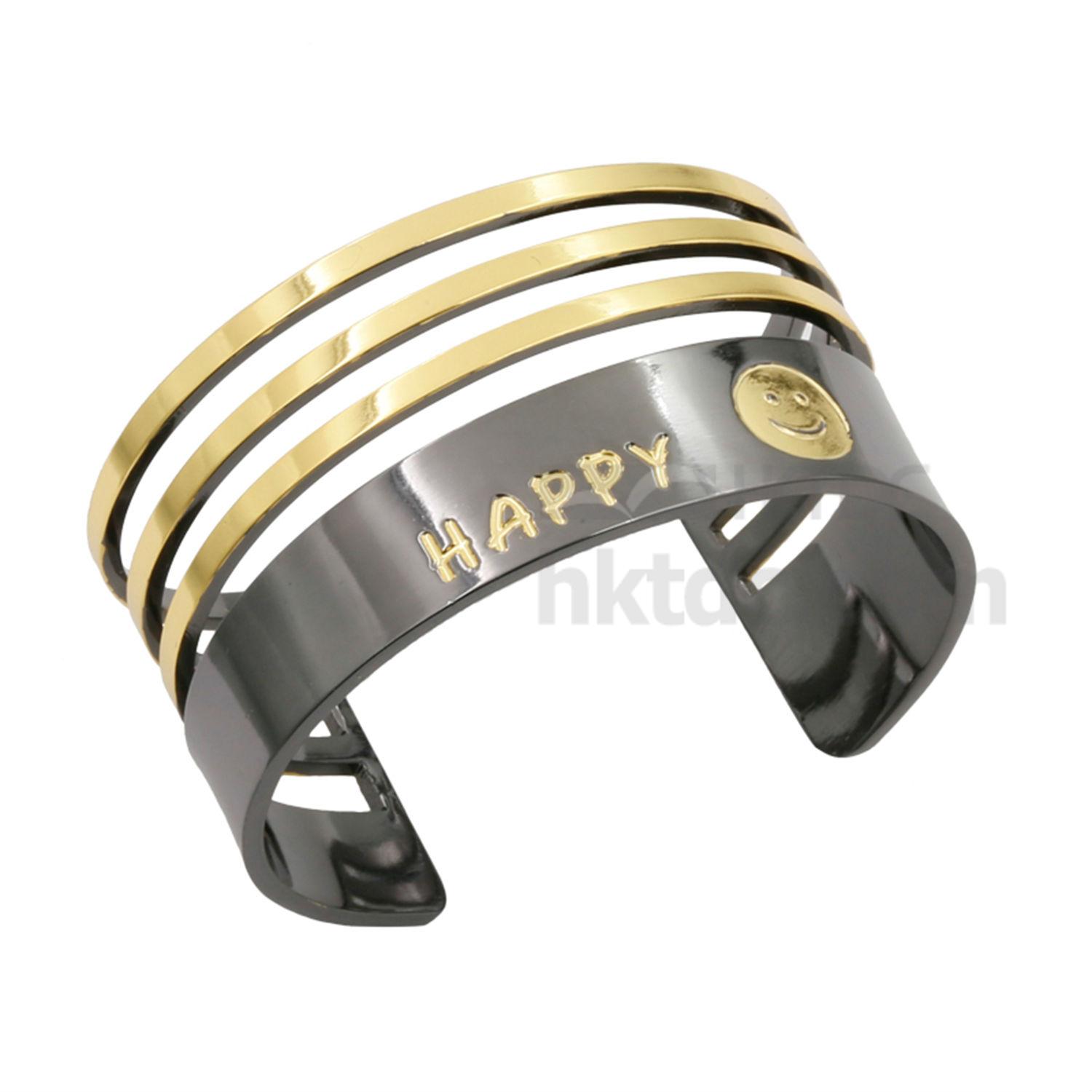 Featured here is a bracelet with a metallic gold toned exterior. It has a wide band with three slim lines on top and is decorated with the word “happy” and a smiley face at the bottom. This bracelet gives off a positive vibe and is a great gift choice for a loved one.