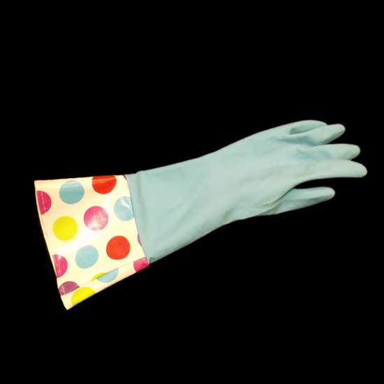 This stylish household gloves spotlights colorful dot patterns on the cuffs. The reliable latex gloves can protect your hands from dirt, water and detergent. They are essential accessories for every housewife.