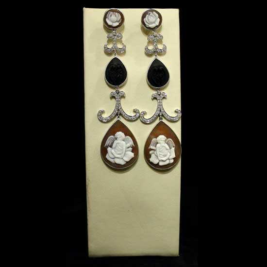 This pair of earrings offers you joy and a peace of mind with the cameo-carved angels. The earrings are finely made with lavastone, shell, white diamonds and white gold. The dangling design allows the earrings to swing and sway with your every body movement.