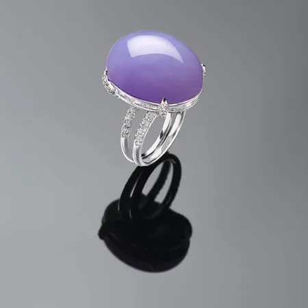 This precious ring is crowned with a rare lavender jadeite cabochon in an oval shape. The dual slim white gold ring bands are studded with white diamonds for added appeal. The timeless ring makes a wonderful addition to any jewelry collection.