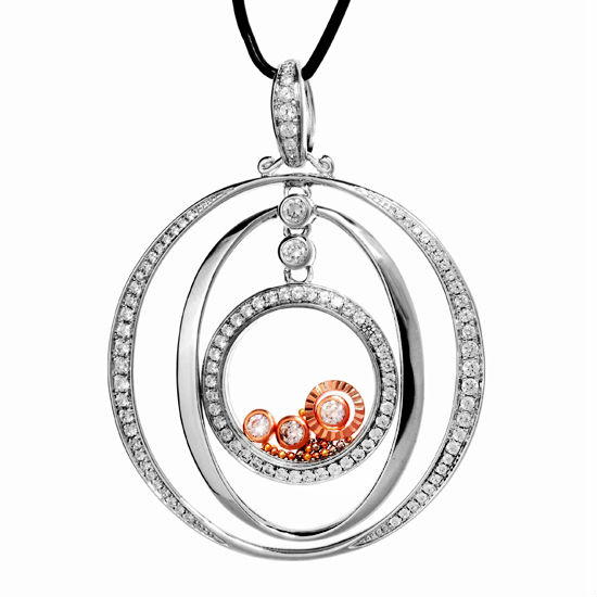 - Cluster of gold-tone discs and faceted CZ stones at the center.