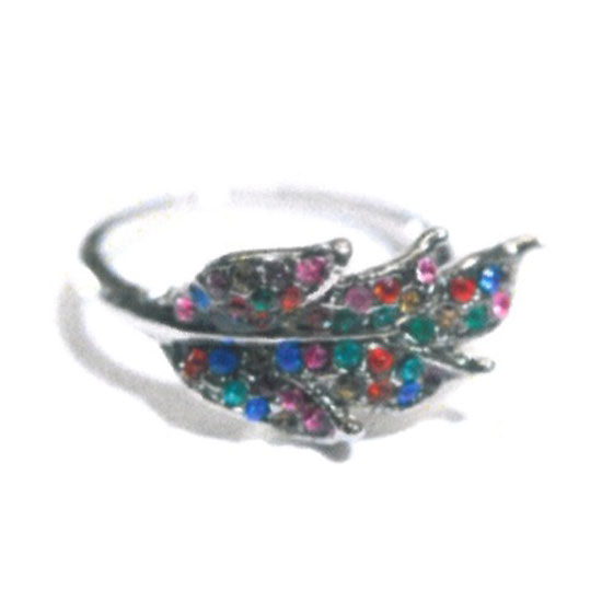 This is a finger ring coming in a leaf shape. It is studded with round, multi-colored crystals for an eye-caching sparkle. Adorn your slender finger with this costume jewelry.
