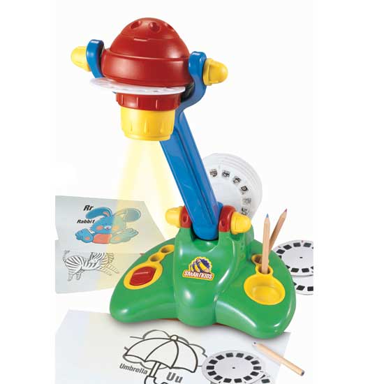 As shown here is a turnable projector that can project images on tables, walls or ceilings. The adjustable arm can change image sizes. This toy projector is easy to play with.