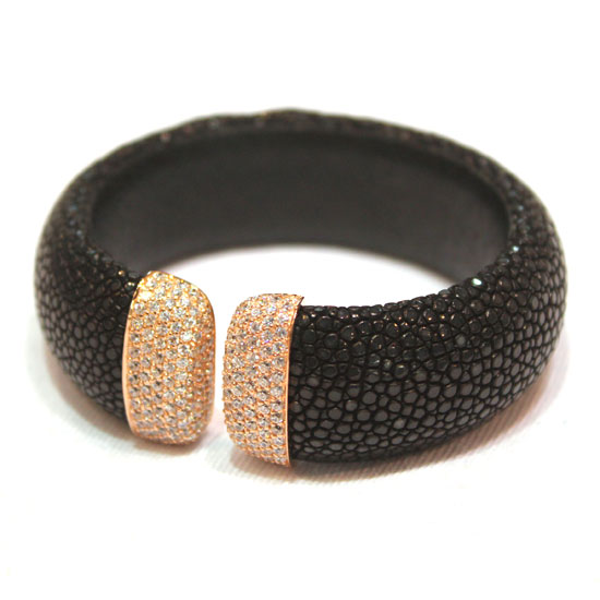 This subtle, luxurious bangle is crafted with black stingray leather, sterling silver and sparkling CZ stones. The textured leather boasts sophisticated charm. This chic and classy bangle is a pleasant choice for parties and dinner occasions.